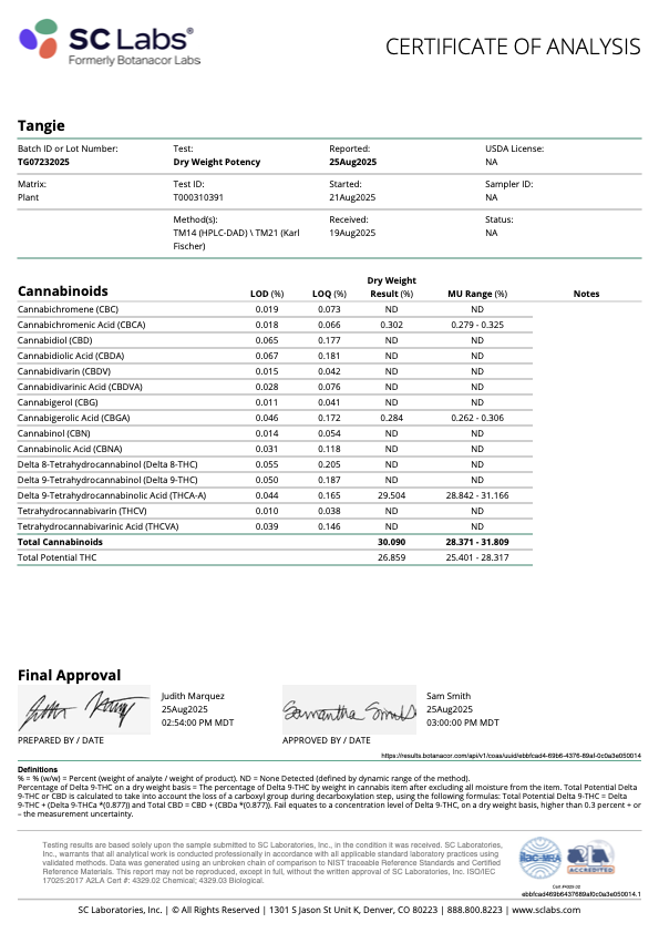 A vibrant sativa-leaning hybrid that brightens your mood and sharpens your focus with a smooth, easygoing body feel. Tangie offers upbeat mental clarity wrapped in juicy citrus energy—perfect for staying present, creative, and comfortable.